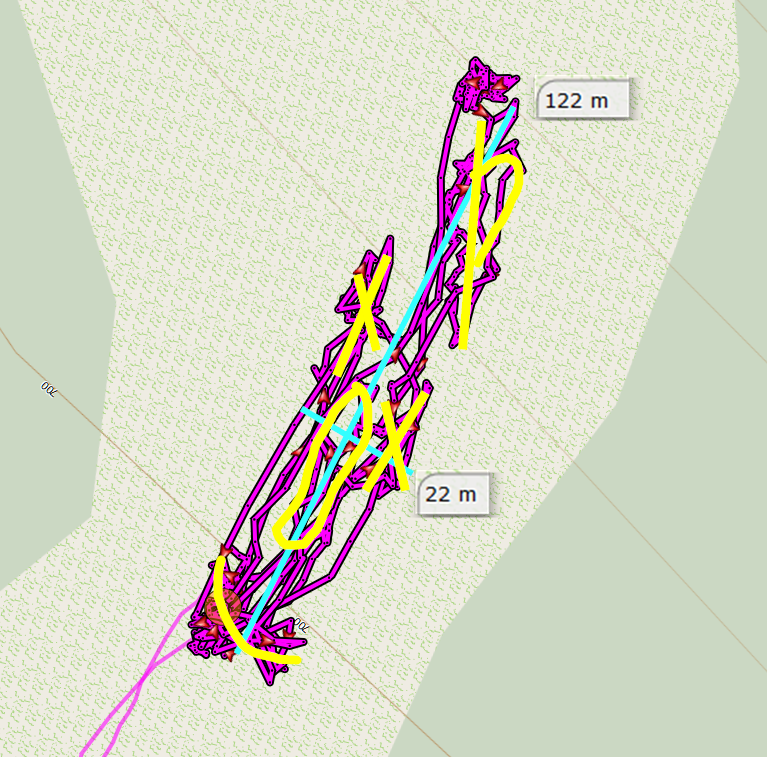 Also habe ich diesmal die Hanglage analysiert und habe festgestellt, dass das Kanonenrohr „eigentlich sehr flach ist“. Auf einer Länge von 120 Meter steigt es nur um ca. 33 Meter (28%). Außerdem kippt der Hang noch seitlich weg, dadurch „verschieben sich die langen Seiten in der Höhe“. Die tiefere Stelle vom „Neujahrs-Kleeblatt“ hat immer hin 33%, ist aber kürzer und kann wegen der Bäume nicht so gut eingesehen werden.