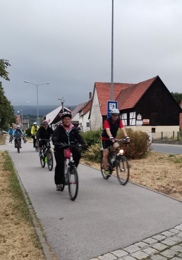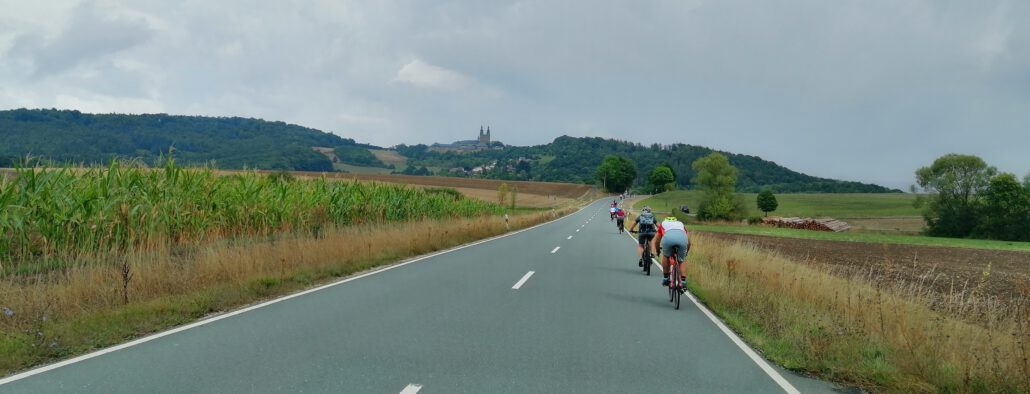 Wieder einmal hat uns unser Radsportwart Siegfried „Siggi“ Neumann nach Vierzehnheiligen geführt. 16 Radfahrende machten sich am letzten Samstag um sechs Uhr morgens von der Kirche in Unterweißenbrunn auf den Weg. Zu Beginn sprach Pater Gabriel ein Gebet und spendete den Segen für eine gute Fahrt. Er weilt derzeit im Unterweißenbrunner Pfarrhaus und sagte gerne zu, diese Radtour zu begleiten. Seine Ausrüstung mit Fahrrad und Radbekleidung bekam er zur Verfügung gestellt. Er erzählte uns, dass er seit drei Jahren, also seit seinem Weggang aus der Rhön, nicht mehr mit dem Rad gefahren sei. Dafür hat er sich sehr gut geschlagen, ein herzliches Dankeschön dafür.