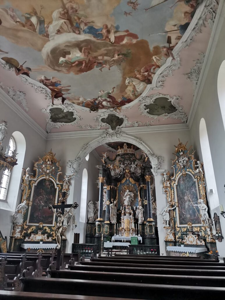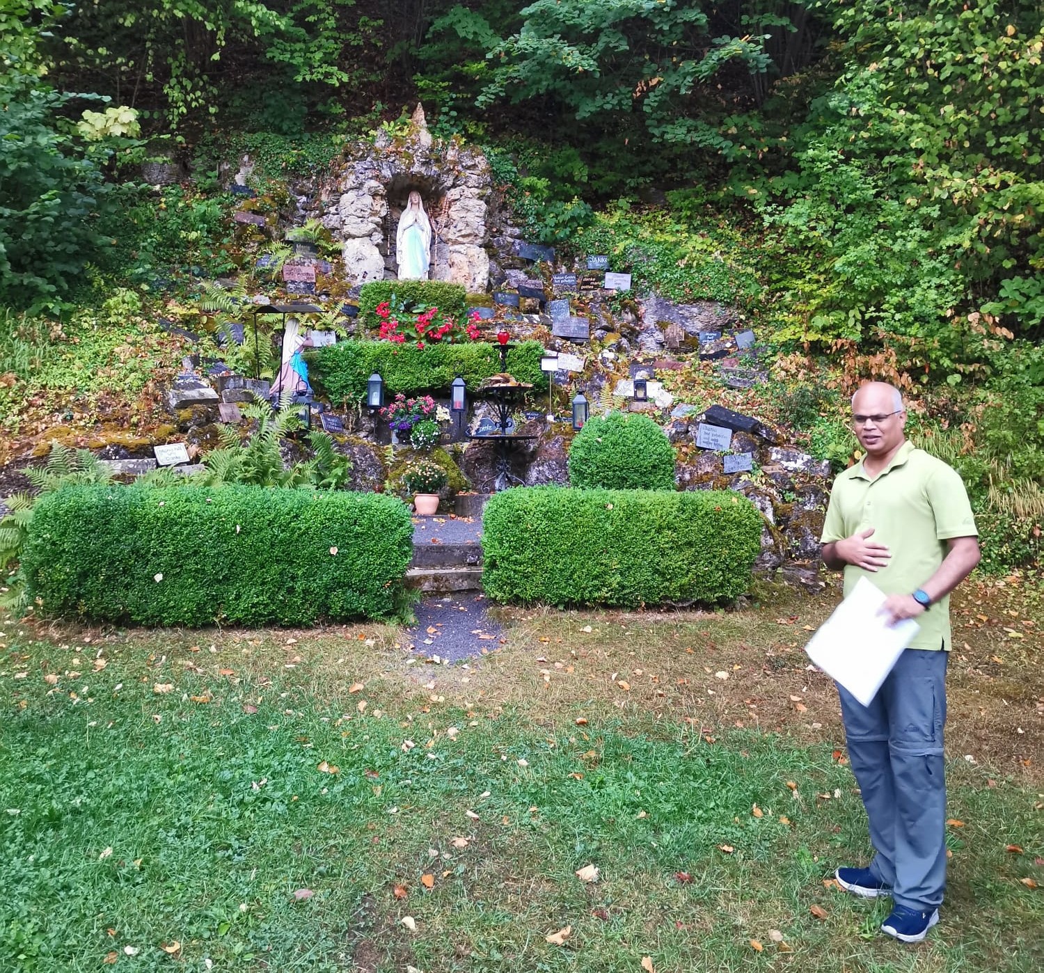Natürlich hat Gabriel für uns an der Hollstadter Grotte eine Andacht gehalten und zum Abschluss in Vierzehnheiligen nochmals mit uns gebetet. Da an diesem Tag die Wallfahrtskirche mit einer Hochzeit und zwei Wallfahrten ausgebucht war, suchten wir uns einen Platz neben der Kirche.