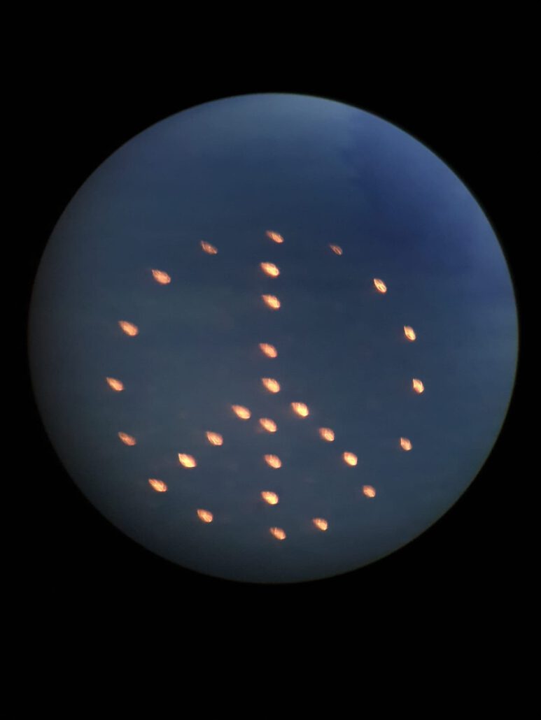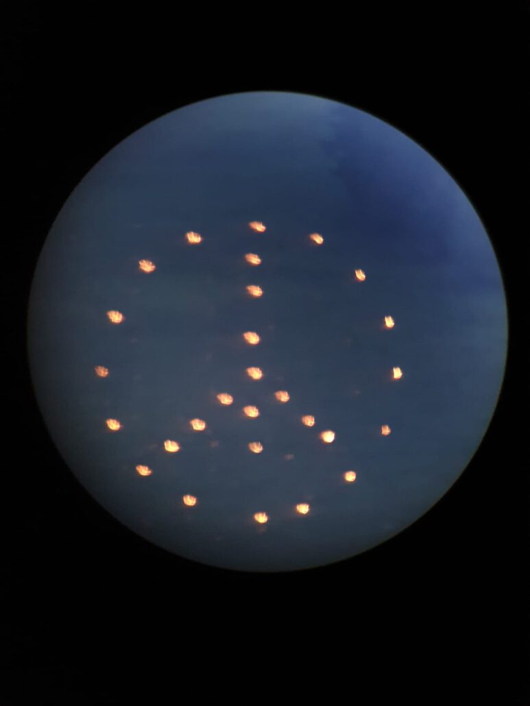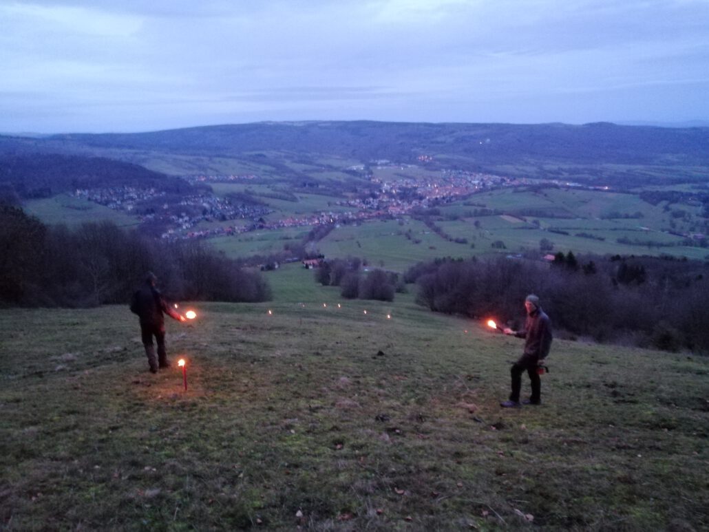 Siegfried Neumann und sein Team haben keine Mühen gescheut, die Fackeln am Kreuzberg am Käulingshang zu stecken. Viermal galt es den Hang zu bezwingen. Zuerst haben wir vier Kontrollpunkte markiert, die in vertikaler Richtung 120 Meter entfernt standen. Im zweiten Durchgang wurden die Fackeln gesteckt, zunächst der Außenkreis, dann die Senkrechte und die Diagonalen. Beim dritten Aufstieg entzündeten wir die Fackeln. Da wir heuer ohne Schnee die abgebrannten, verkohlten Reste nicht mehr alle gefunden hätten, wurden die Fackeln vor dem kompletten Abbrennen gelöscht und somit beim vierten Aufsteigen wieder eingesammelt. Also, wir haben uns für den „Frieden“ so richtig ins Zeug gelegt